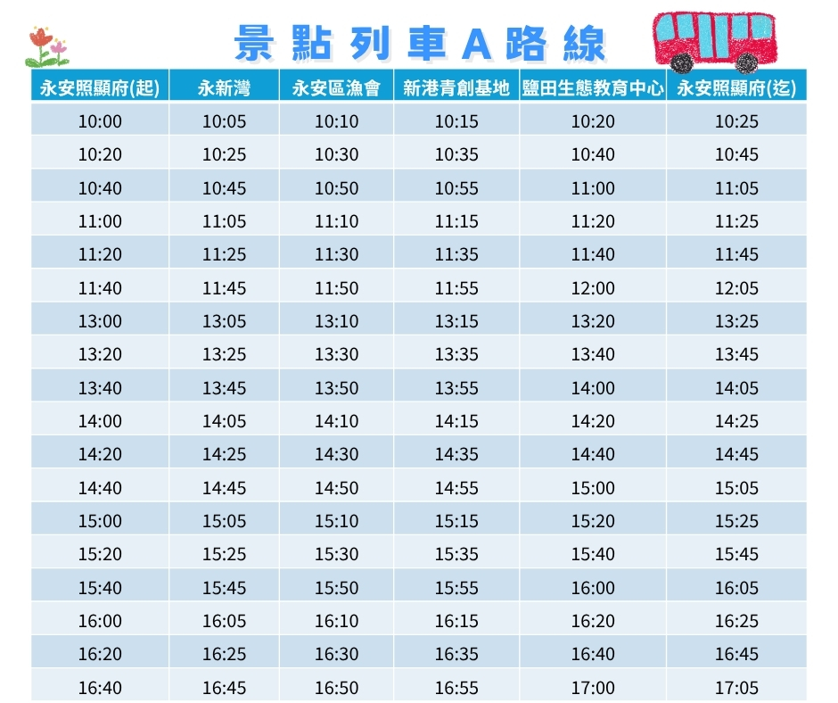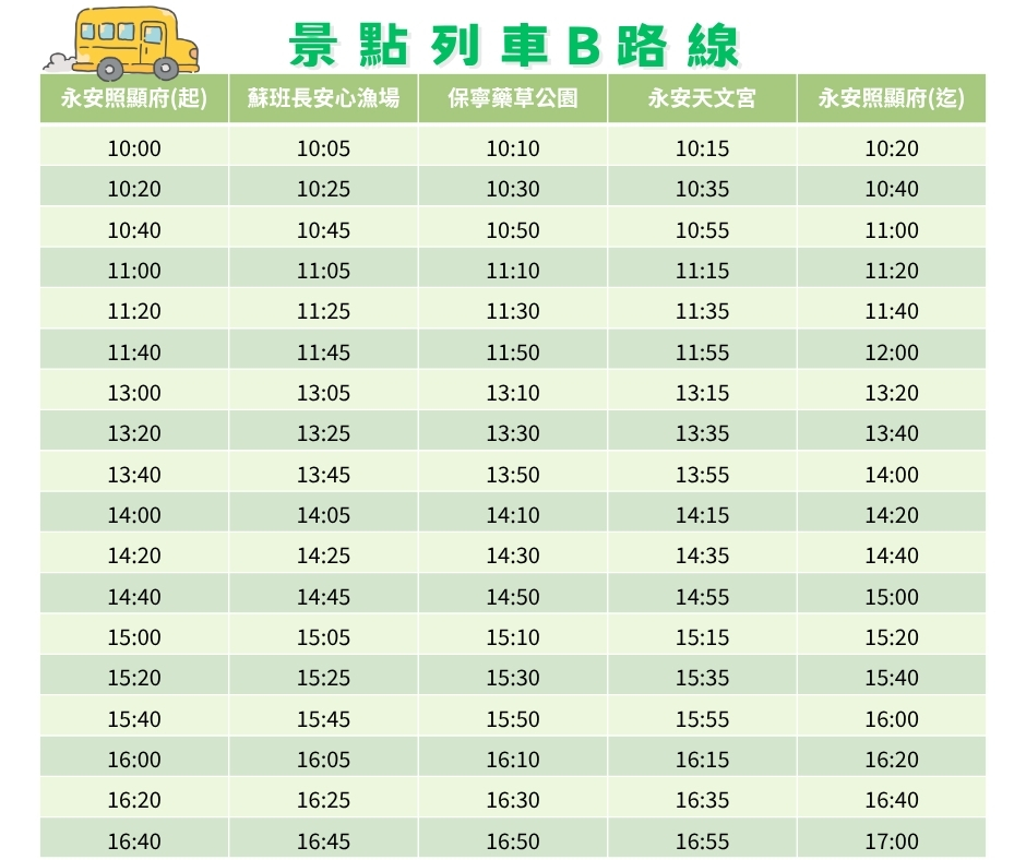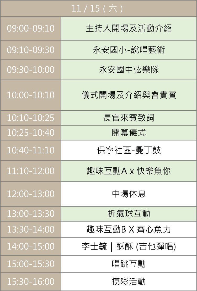路線:永安照顯府出發 → 蘇班長安心魚場(影片播放介紹+11/15(六)14:10-15:10懷舊牽罟體驗+石斑魚湯品嚐+販售水產品/文創商品) → 保寧藥草公園(草仔粿製作+藥草導覽+薩克斯風表演) → 永安天文宮(寺廟導覽+免費提供小飲料)