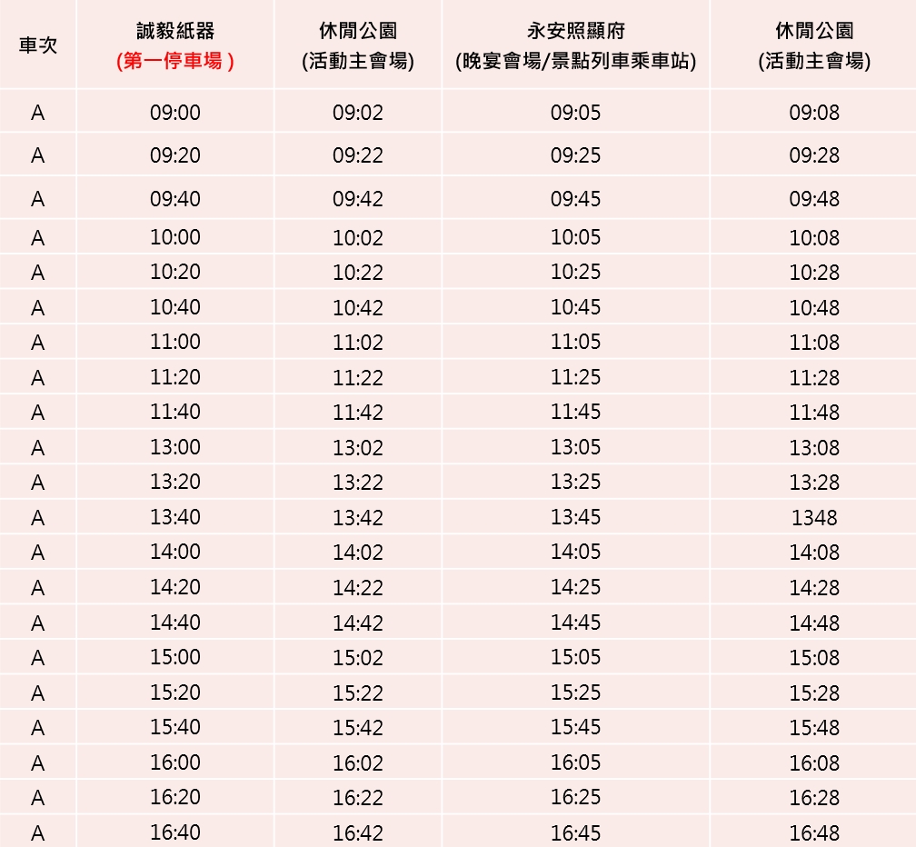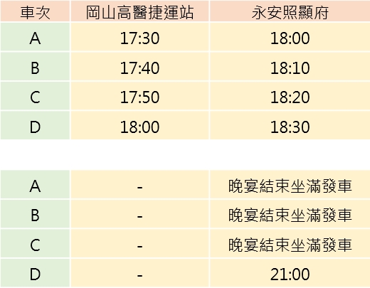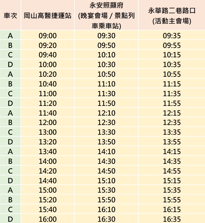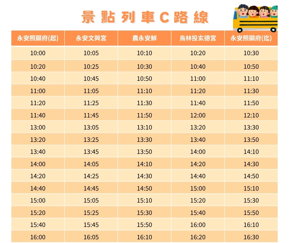 路線:永安照顯府 → 永安文興宮(寺廟導覽+免費贈送錢母) → 農永安鮮(展售中心有週年慶促銷活動及抽獎活動) → 烏林投玄德宮(寺廟導覽+步道引導+可享用泡麵)